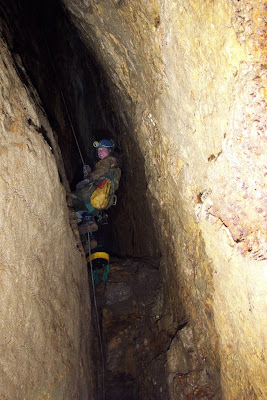 After quite some faffing and cake we did get our act together anyway. Great Rock it would indeed be! Dave would stay behind; there was one of the founding members present; a chap by the name of John, and they had a lot to discuss. And the 50 years of the existence of the club, as well as all the years he had already lived pre-club, had taken their toll on John, and he wasn't up for frolicking through mines anymore. So it was a 7 person sub-group that went. When we were walking up the sunny hillside to the entrance we figured we only had an hour. We had to be back in time for the anniversary dinner! But an hour is enough to see some nice stuff. We went into heaven and hell;